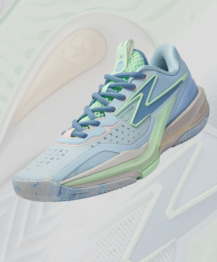 The drive plate, consisting of Qu!kCQTECH midsole (upper layer), fork-shaped nylon anti-torsion piece(middle layer), and QU!KFOAM LIGHT foam (bottom layer), provides more powerful propulsion.