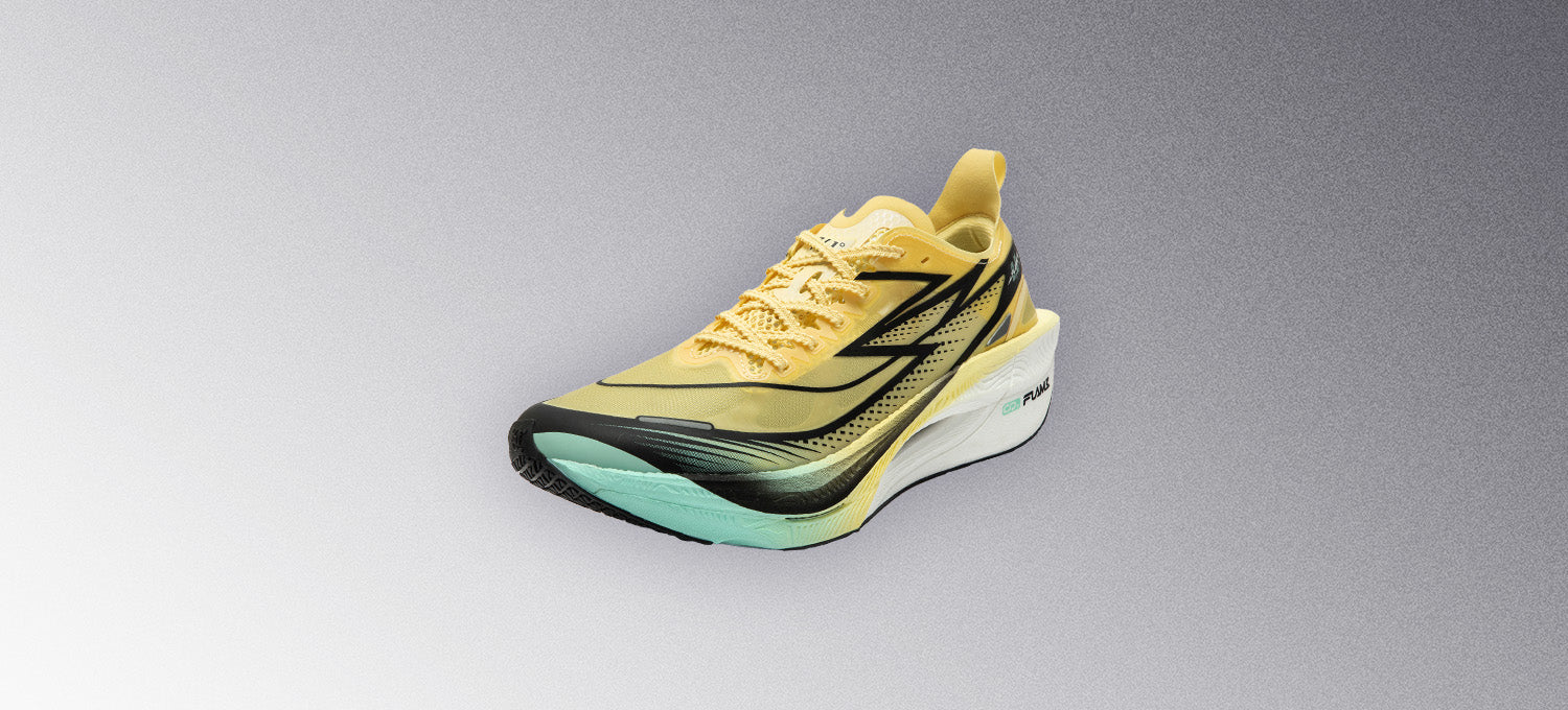 Qu!kBONE DYNAM!C carbon-fiber plate for support and rigidity, YES WINDOW for propulsion, and Qu!kFLAMECQT(FLAMECQT) midsole for springiness and cushioning.