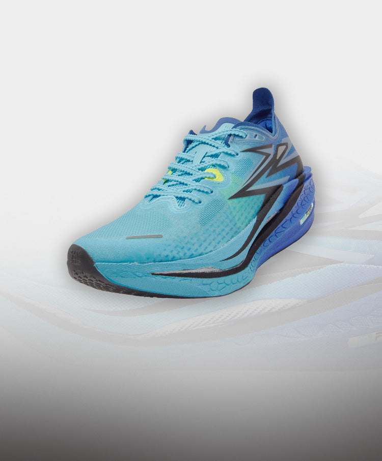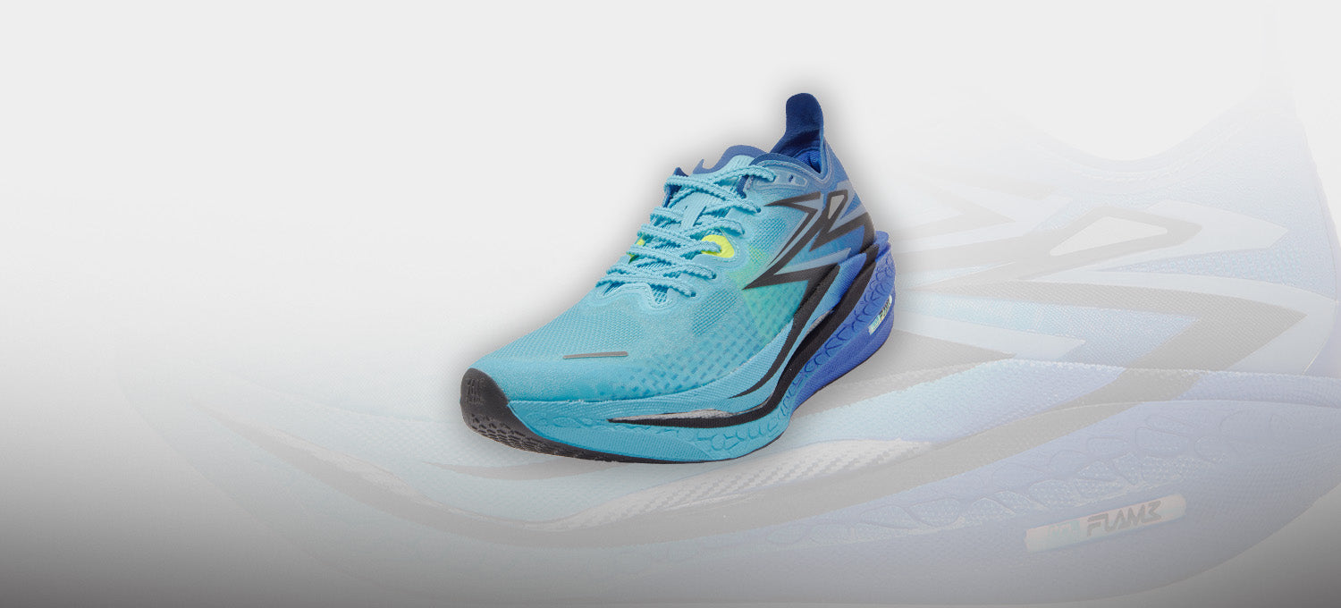 Double-layer Qu!kFLAMECQT (FLAMECQT) midsole for lighter weight, more springiness, and better cushioning, effectively saving energy for long-distance running activities.